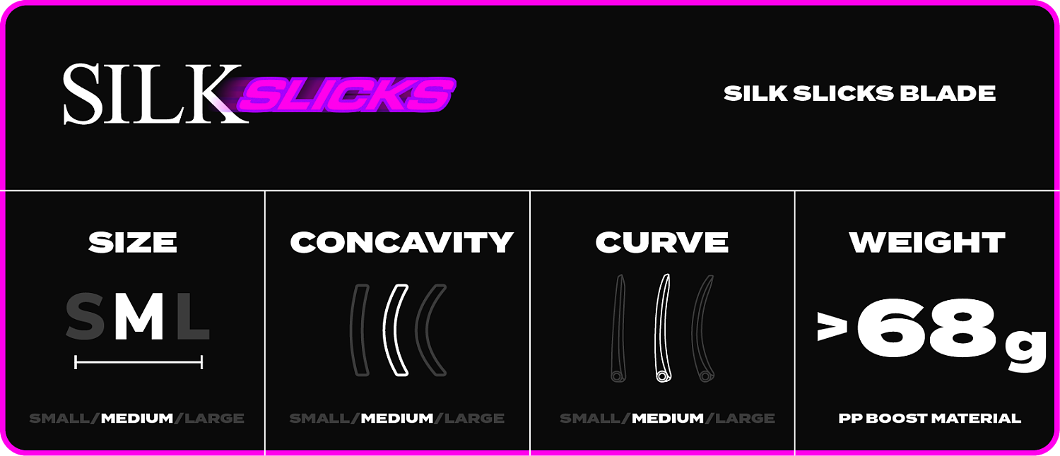 Nová revoluční čepel SILK SLICKS – nejjemnější čepel SILK je nyní vybavena technologií SLICKS! Hedvábně hladký materiál PP Soft (PPS) v kombinaci s kluzkým materiálem PE tvoří perfektní spojení pro rychlé a hladké ovládání míčku. Technologie SLICKS z PE plastu poskytuje lepší skluz než u běžné PP čepele na každém povrchu, přičemž zachovává jemný a citlivý kontakt materiálu PP Soft.